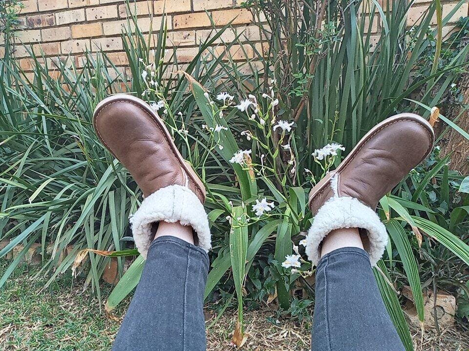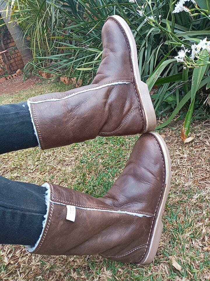 I just received my pair of Snuggs and I can't say enough how happy I am! Thank you Humba Hides! They are well made, soft and soooo comfortable. I was a little worried about the size, but they fit perfectly! Love the colour! I even fold the top down to make them look like Eskimo boots and it's a whole different look! When I wear them under long pants I can turn them up again. I can already tell these are made to last, worth every $!!